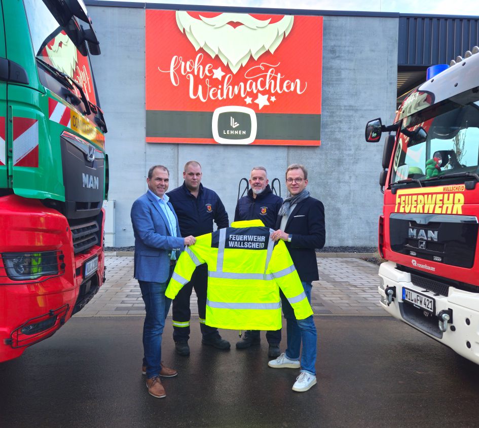 Die LEHNEN-Gruppe und die RBB Aluminium Profiltechnik AGunterstützen die Freiwillige Feuerwehr Wallscheid mit neuen Regenjacken. Bei der Übergabe am Betriebshof in Föhren überreichten Christoph Lehnen und Alexander Beu die Jacken an Wehrführer Johannes Schauster und den Ortsbürgermeister von Wallscheid Uwe Kröffges. Als ausgezeichneter „Partner der Feuerwehr“ (2025) bekennt sich die LEHNEN-Gruppe zu ihrer Verantwortung in der Region und fördert das Ehrenamt ganz praktisch.