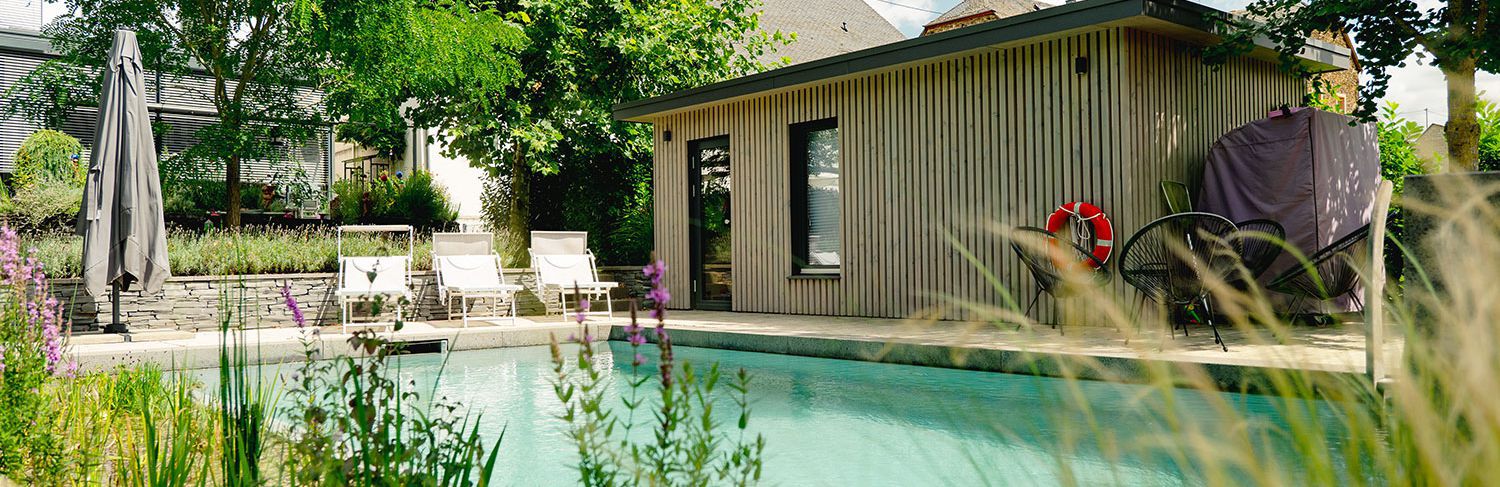 Wir durften ein besonderes Projekt in Eigenregie für unsere Kunden umsetzen, von der Planung und Konzeption bis zur regelmäßigen Pflege. Dabei entstand eine Naturpoolanlage im 2-Kammer-System, bei dem der Schwimmbereich vom Filterbereich getrennt ist. Vier Photovoltaik-betriebene Pumpen, kombiniert mit Schwammfiltern und einer UV-Kläreinheit, sorgen für klares Wasser. Alle Belagsarbeiten aus Naturstein und Holz wurden aus eigener Hand ausgeführt. Die Ausstattungsgegenstände wurden in Absprache mit den Kunden geliefert. Das Pflanzkonzept und die Pflanzung wurden ebenfalls von uns übernommen.