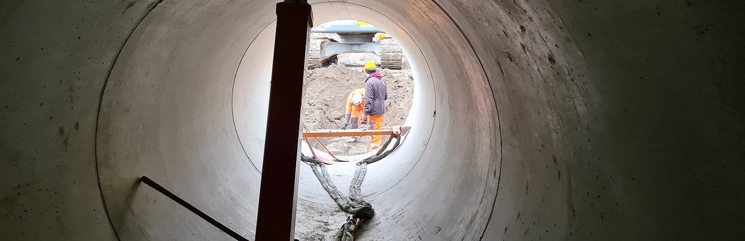 Verlegung von 60 m SB-Rohr DN 2200 (Gewicht pro Rohr ca. 11 t) |