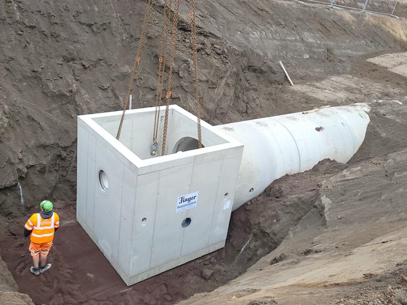 Einbau von 2 Staukanalbauwerken, Abmessung 3,50 x 3,50 x 4,60 (Einzelgewicht ca. 30 t) |