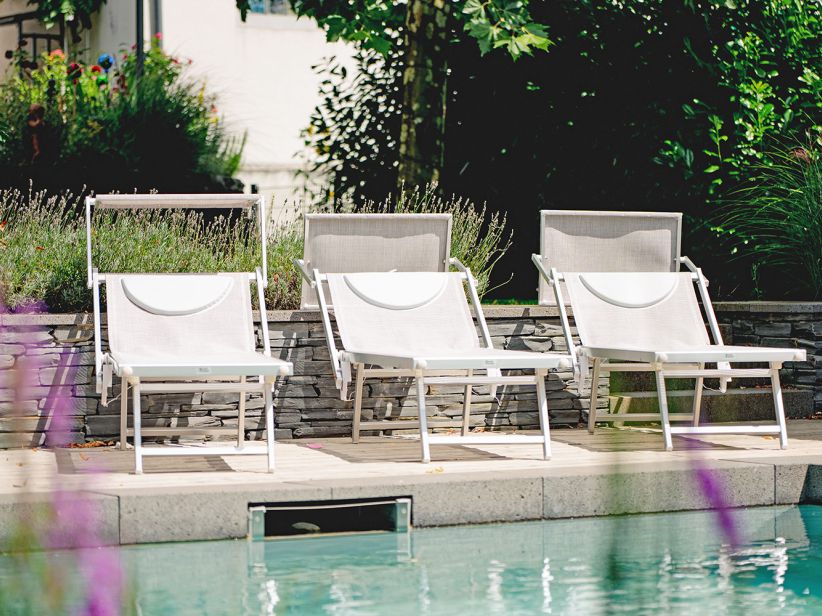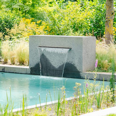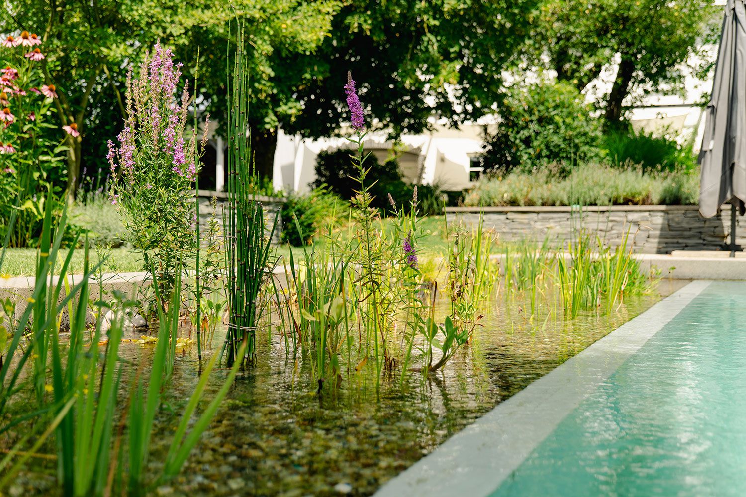 Wir durften ein besonderes Projekt in Eigenregie für unsere Kunden umsetzen, von der Planung und Konzeption bis zur regelmäßigen Pflege. Dabei entstand eine Naturpoolanlage im 2-Kammer-System, bei dem der Schwimmbereich vom Filterbereich getrennt ist. Vier Photovoltaik-betriebene Pumpen, kombiniert mit Schwammfiltern und einer UV-Kläreinheit, sorgen für klares Wasser. Alle Belagsarbeiten aus Naturstein und Holz wurden aus eigener Hand ausgeführt. Die Ausstattungsgegenstände wurden in Absprache mit den Kunden geliefert. Das Pflanzkonzept und die Pflanzung wurden ebenfalls von uns übernommen.
